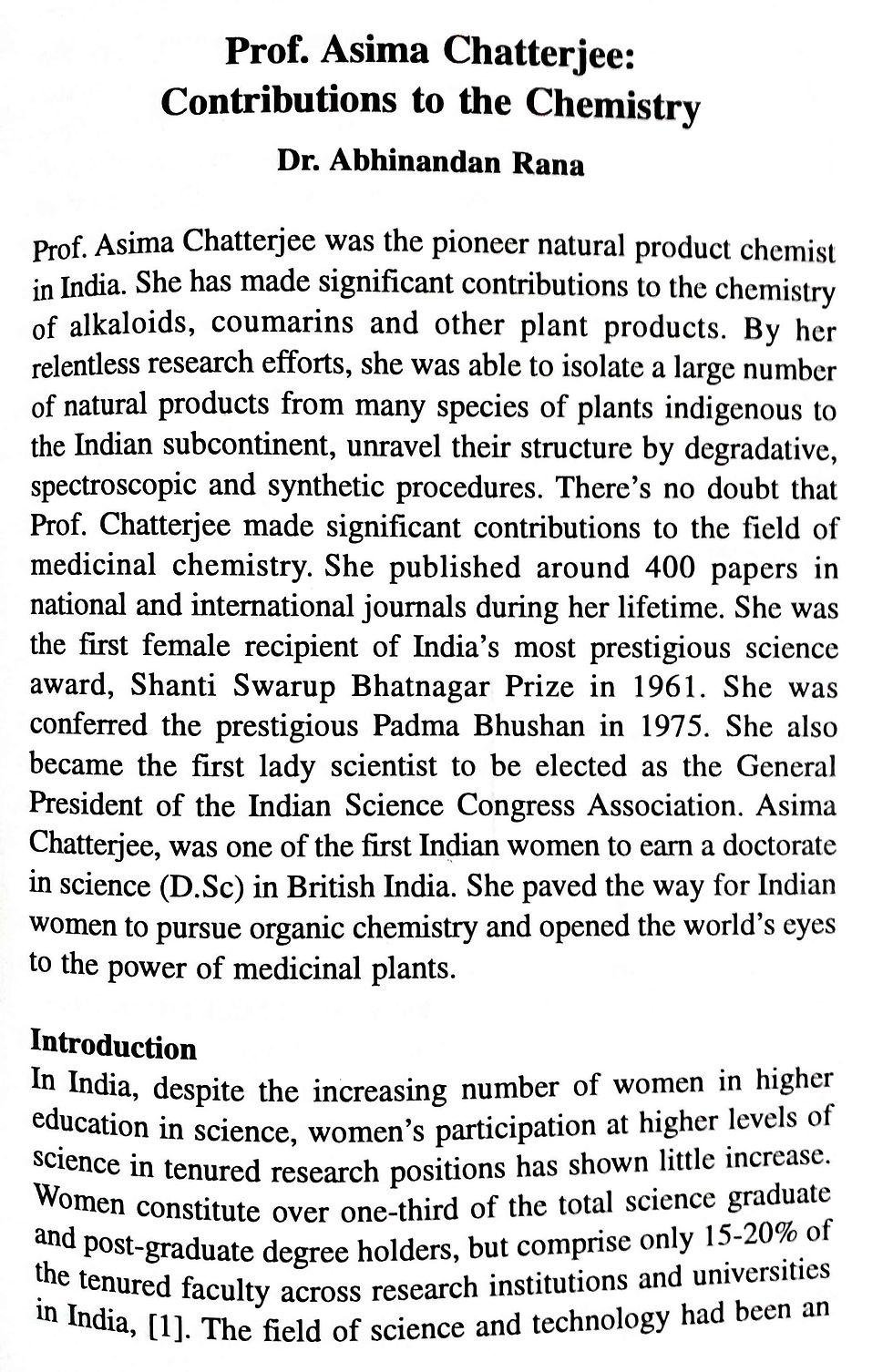Prof. Asima Chatterjee: Contributions to the chemistry